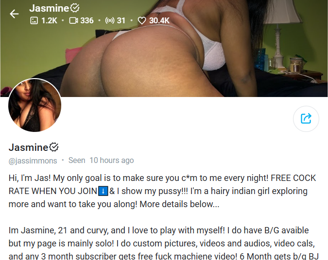 Jasmine is a 21-year-old curvy Indian creator based in Washington D.C., delivering consistent, high-engagement solo content. Her growing popularity among Indian OnlyFans and NRI Indians on OnlyFans is driven by authenticity, frequency, and direct fan interaction. She claims to be a proud hairy creator for her audience.